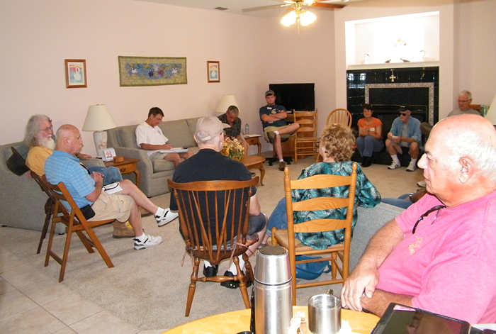 Attendees discuss radio before the meeting. Left to right, Buddy, Matthew, John, and Rich. Bill, not shown, was taking the picture.